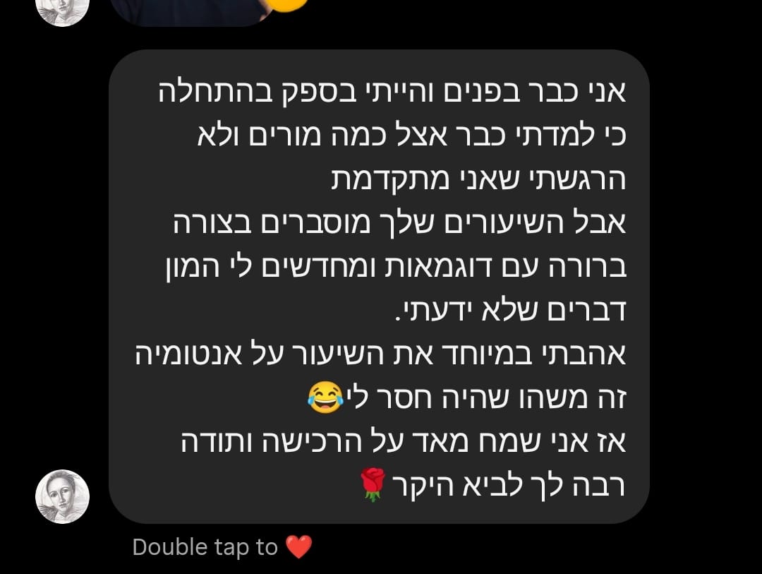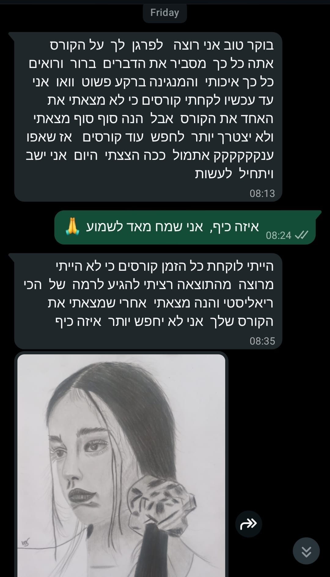 כל שיעור מוסבר בפירוט מקסימלי, עם דוגמאות חיות שבהן אתה רואה אותי מצייר צעד אחר צעד. אם משהו לא ברור, יש קבוצת פייסבוק סגורה שבה אני עונה אישית על כל שאלה. אתה לא לבד במסע הזה.