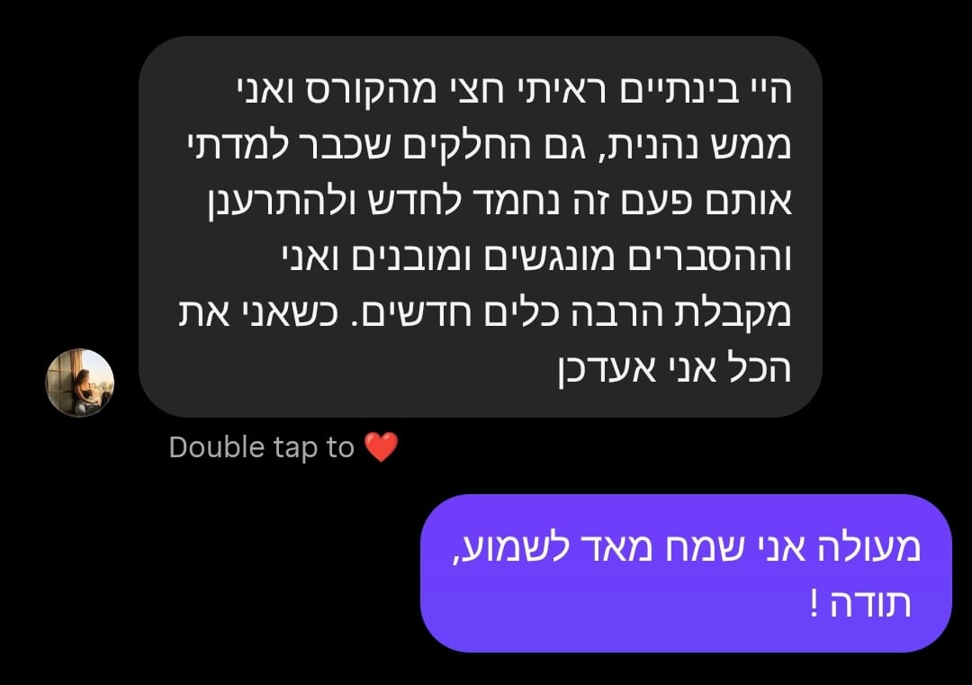 הקורס מתוכנן בדיוק בשביל אנשים עסוקים כמוך. 15 דקות ביום - פחות מהזמן שאתה מבלה ברשתות חברתיות. אתה לומד מתי שנוח לך, בקצב שלך, בלי מועדים ובלי לחץ. הקורס שלך לכל החיים.